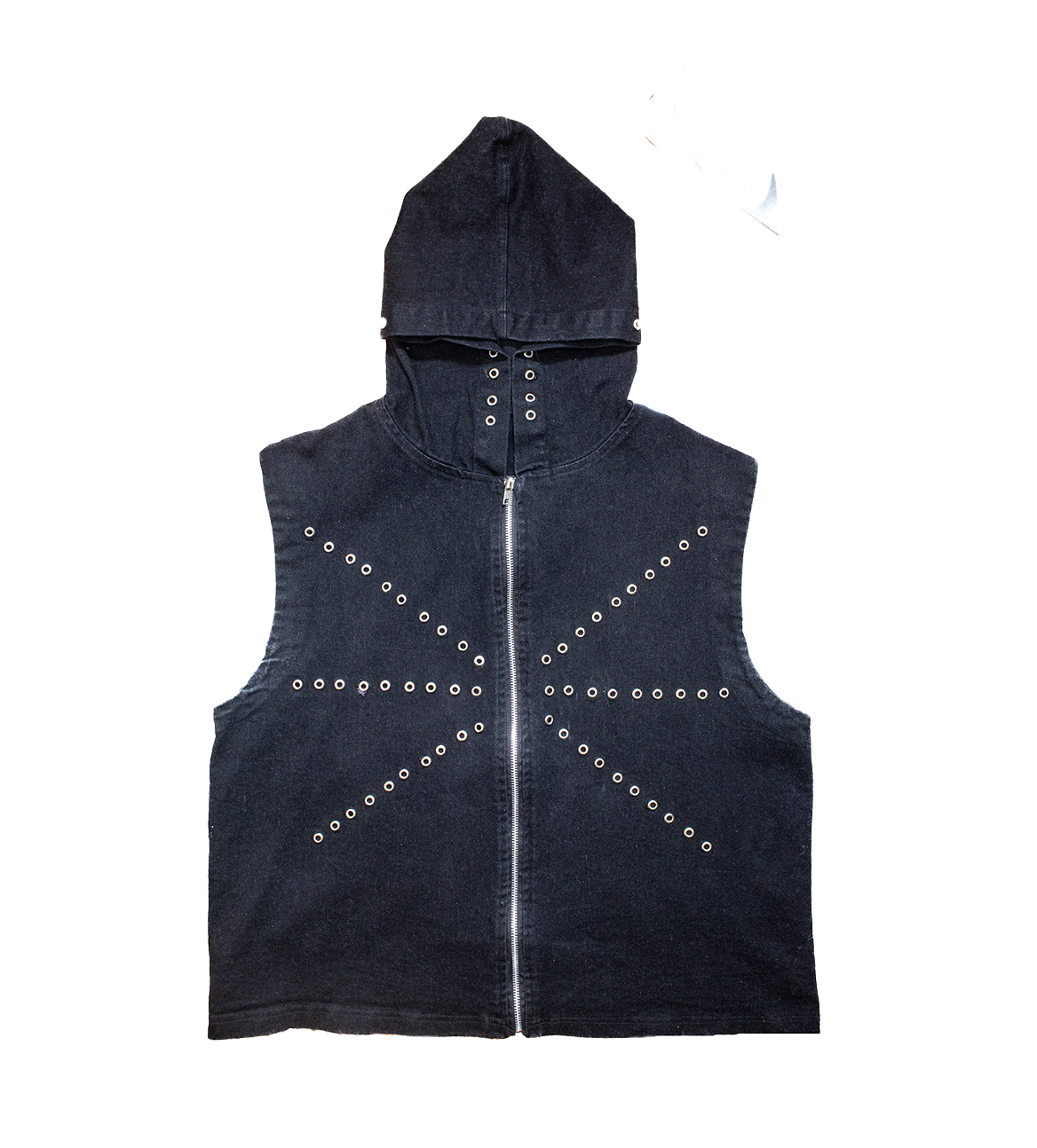 Chaleco negro unisex. Diseño versátil con gorro integrado, adornado con ojillos metálicos que recorren todo su contorno y la parte frontal del chaleco. En la espalda, destaca un gráfico impactante con la palabra “ANARCHY” serigrafiada